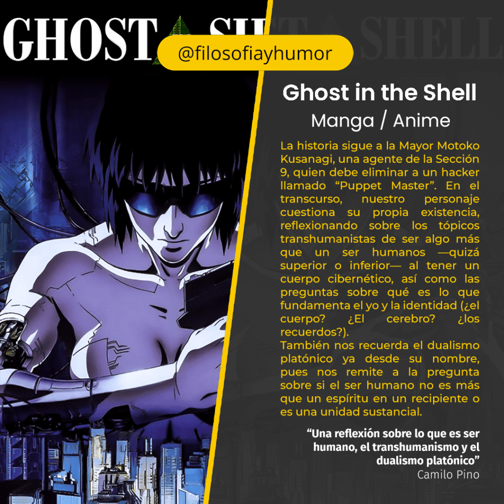 La historia sigue a la Mayor Motoko Kusanagi, una agente de la Sección 9, quien debe eliminar a un hacker llamado “Puppet Master”. En el transcurso, nuestro personaje cuestiona su propia existencia, reflexionando sobre los tópicos transhumanistas de ser algo más que un ser humanos —quizá superior o inferior— al tener un cuerpo cibernético, así como las preguntas sobre qué es lo que fundamenta el yo y la identidad (¿el cuerpo? ¿El cerebro? ¿los recuerdos?).