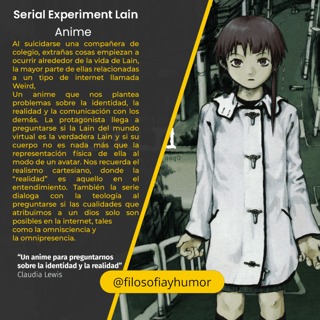 Un anime que nos plantea problemas sobre la identidad, la realidad y la comunicación con los demás. La protagonista llega a preguntarse si la Lain del mundo virtual es la verdadera Lain y si su cuerpo no es nada más que la representación física de ella al modo de un avatar. Nos recuerda el realismo cartesiano, donde la “realidad” es aquello en el entendimiento. También la serie dialoga con la teología al preguntarse si las cualidades que atribuimos a un dios solo son posibles en la internet, tales como la omnisciencia y la omnipresencia.