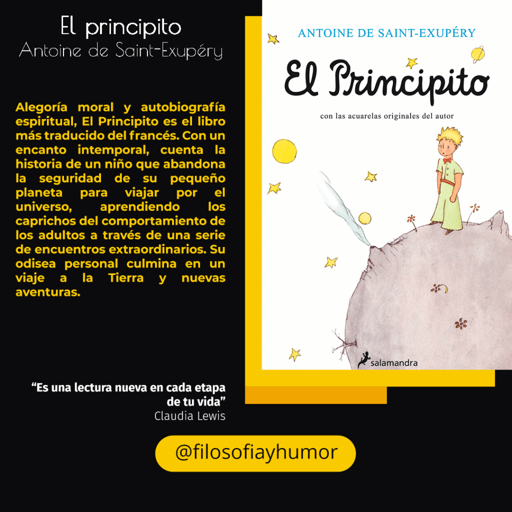 Alegoría moral y autobiografía espiritual, El Principito es el libro más traducido del francés. Con un encanto intemporal, cuenta la historia de un niño que abandona la seguridad de su pequeño planeta para viajar por el universo, aprendiendo los caprichos del comportamiento de los adultos a través de una serie de encuentros extraordinarios. Su odisea personal culmina en un viaje a la Tierra y nuevas aventuras.
