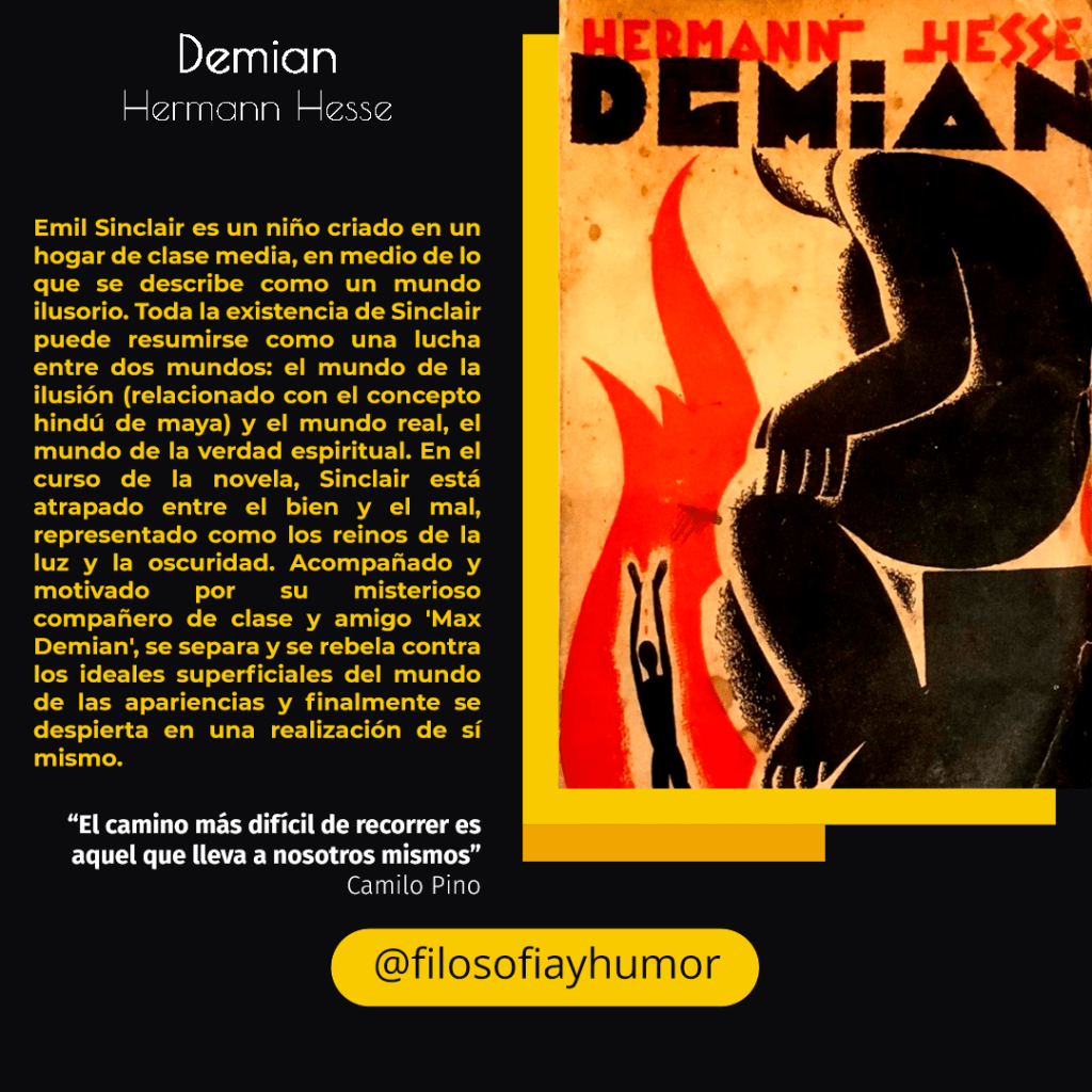 Emil Sinclair es un niño criado en un hogar de clase media, en medio de lo que se describe como un mundo ilusorio. Toda la existencia de Sinclair puede resumirse como una lucha entre dos mundos: el mundo de la ilusión (relacionado con el concepto hindú de maya) y el mundo real, el mundo de la verdad espiritual. En el curso de la novela, Sinclair está atrapado entre el bien y el mal, representado como los reinos de la luz y la oscuridad. Acompañado y motivado por su misterioso compañero de clase y amigo ‘Max Demian’, se separa y se rebela contra los ideales superficiales del mundo de las apariencias y finalmente se despierta en una realización de sí mismo.