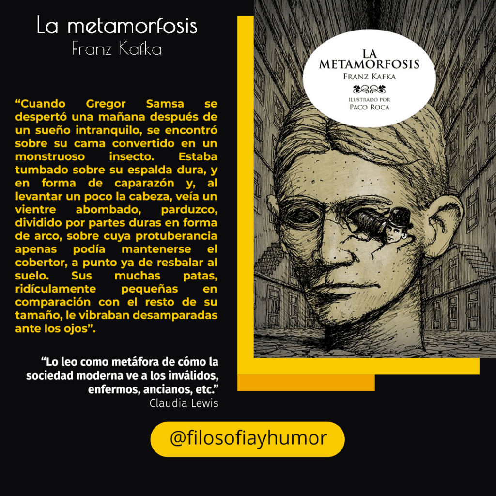 “Cuando Gregor Samsa se despertó una mañana después de un sueño intranquilo, se encontró sobre su cama convertido en un monstruoso insecto. Estaba tumbado sobre su espalda dura, y en forma de caparazón y, al levantar un poco la cabeza, veía un vientre abombado, parduzco, dividido por partes duras en forma de arco, sobre cuya protuberancia apenas podía mantenerse el cobertor, a punto ya de resbalar al suelo. Sus muchas patas, ridículamente pequeñas en comparación con el resto de su tamaño, le vibraban desamparadas ante los ojos”
