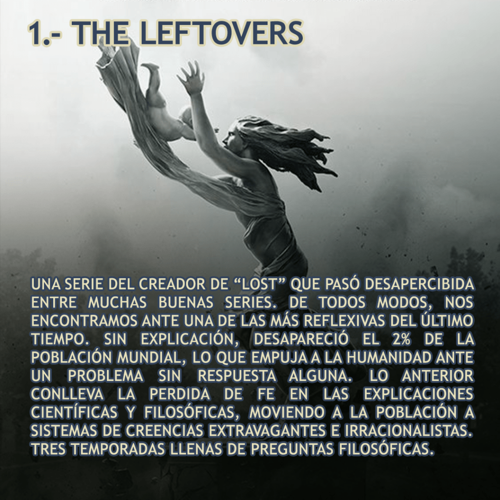 Una serie del creador de “Lost” que pasó desapercibida entre muchas buenas series. De todos modos, nos encontramos ante una de las más reflexivas del último tiempo. Sin explicación, desapareció el 2% de la población mundial, lo que empuja a la humanidad ante un problema sin respuesta alguna. Lo anterior conlleva la perdida de fe en las explicaciones científicas y filosóficas, moviendo a la población a sistemas de creencias extravagantes e irracionalistas. Tres temporadas llenas de preguntas filosóficas.