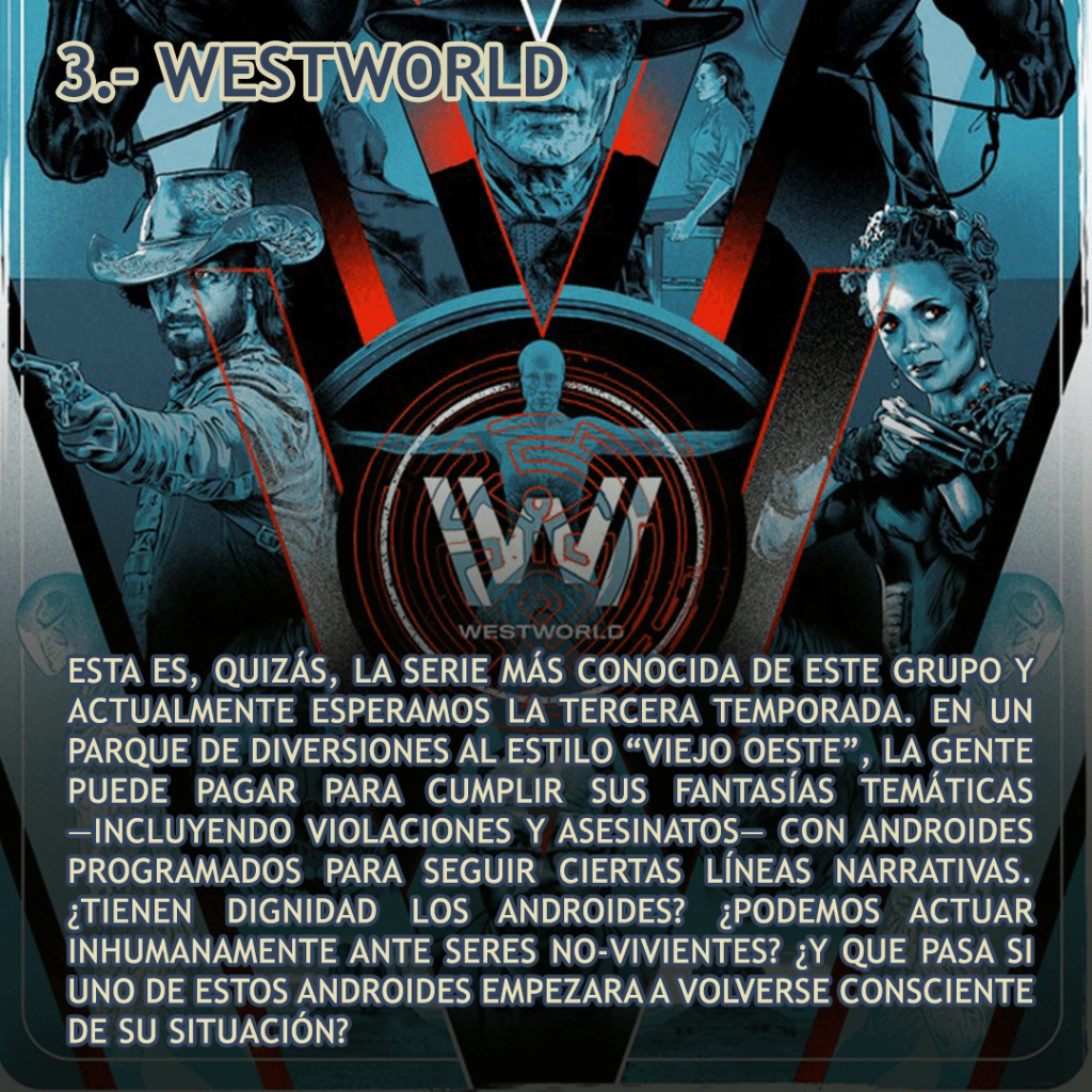 Esta es, quizás, la serie más conocida de este grupo y actualmente esperamos la tercera temporada. En un parque de diversiones al estilo “viejo oeste”, la gente puede pagar para cumplir sus fantasías temáticas —incluyendo violaciones y asesinatos— con androides programados para seguir ciertas líneas narrativas. ¿Tienen dignidad los androides? ¿Podemos actuar inhumanamente ante seres no-vivientes? ¿Y que pasa si uno de estos androides empezara a volverse consciente de su situación?