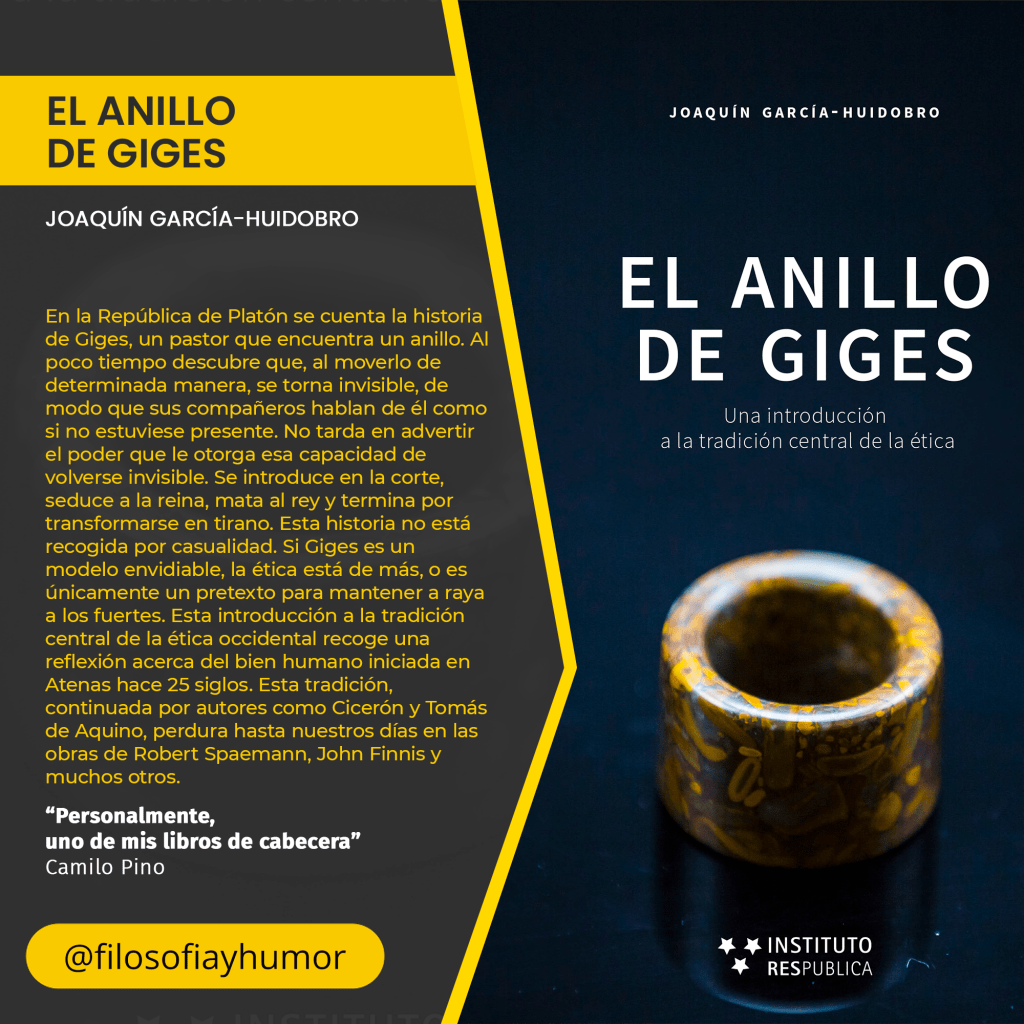 En la República de Platón se cuenta la historia de Giges, un pastor que encuentra un anillo. Al poco tiempo descubre que, al moverlo de determinada manera, se torna invisible, de modo que sus compañeros hablan de él como si no estuviese presente. No tarda en advertir el poder que le otorga esa capacidad de volverse invisible. Se introduce en la corte, seduce a la reina, mata al rey y termina por transformarse en tirano. Esta historia no está recogida por casualidad. Si Giges es un modelo envidiable, la ética está de más, o es únicamente un pretexto para mantener a raya a los fuertes. Esta introducción a la tradición central de la ética occidental recoge una reflexión acerca del bien humano iniciada en Atenas hace 25 siglos. Esta tradición, continuada por autores como Cicerón y Tomás de Aquino, perdura hasta nuestros días en las obras de Robert Spaemann, John Finnis y muchos otros.