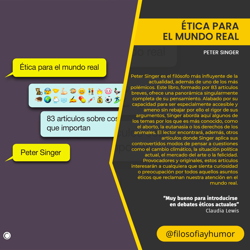 Peter Singer es el filósofo más influyente de la actualidad, además de uno de los más polémicos. Este libro, formado por 83 artículos breves, ofrece una panorámica singularmente completa de su pensamiento. Alabado por su capacidad para ser especialmente accesible y ameno sin rebajar por ello el rigor de sus argumentos, Singer aborda aquí algunos de los temas por los que es más conocido, como el aborto, la eutanasia o los derechos de los animales. El lector encontrará, además, otros artículos donde Singer aplica sus controvertidos modos de pensar a cuestiones como el cambio climático, la situación política actual, el mercado del arte o la felicidad. Provocadores y originales, estos artículos interesarán a cualquiera que sienta curiosidad o preocupación por todos aquellos asuntos éticos que reclaman nuestra atención en el mundo real.