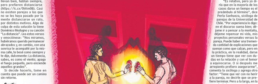Camilo Pino, docente del Instituto de Filosofía de la Universidad San Sebastián y parte de Filosofía y humor (@filosofiayhumor en Instagram), hace referencia a la filósofoa francesa del siglo XX, Simon Weil, que dice que la distancia es parte fundamental del amor. “Hay algo de purificador en la separación, porque cuando se está con la otra persona cotidianamente, el amor puede pasar a convertirse en mera gratificación personal y nuestra pareja se convierte en objeto”, opina. “A veces, es necesario vovler a esa distancia inicial de las relaciones para percibir a las personas como cuando nos enamoramos. La diistancia puede dar lugar a la contemplación y al respeto mutuo, enriquciendo la relación en lugar de debilitarla, como sería en el caso de la separación”, comenta. “Creo que Simon Weil nos diría que aquellas parejass que han decidido separarse por un tiempo en lugar de terminar, simplemente, lo hacen porque todavía sienten que el amor tiene oportunidad”, resume el académico con optimismo en el amor.